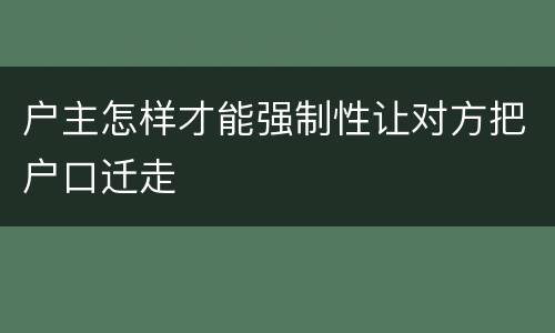 1、户主无法强制迁出他人户口。2、离婚当事人可持原户口簿和法院的判决书或调解书,到当地派出所办理分户或迁转手续,当地派出所应依据法院的判决或调解书,按照相关规定予以办理。一方当事人经派出所动员说服调解